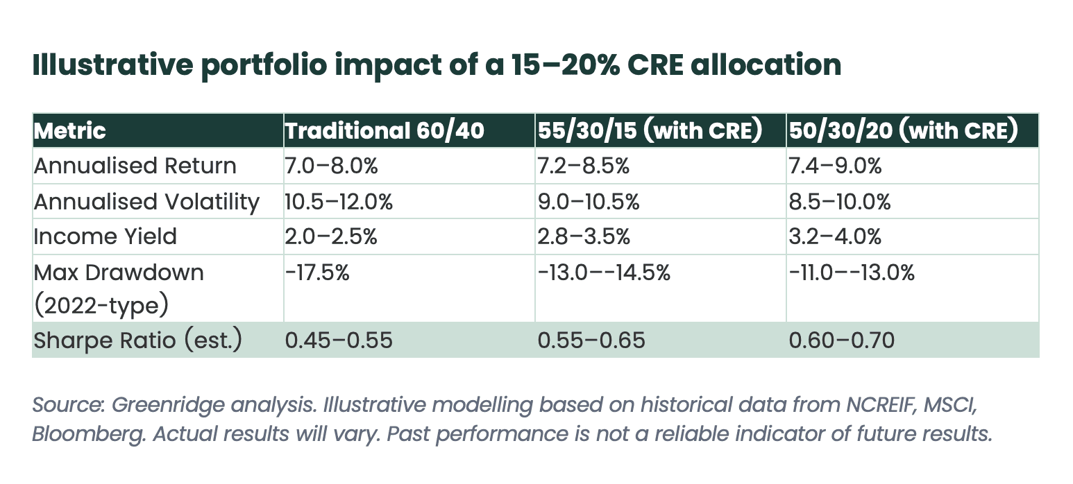Academic and institutional research consistently identifies a 10-20% portfolio allocation to private real estate as the range that optimises diversification benefits without excessive illiquidity. Within this range, income-led strategies should form the core, supplemented by selective value-add or opportunistic plays where appropriate.